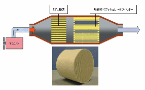 ュレートが堆積するフィルタの自己再生不能に陥ることが問題だ。また高速道路においてもトラックが空荷で走行す る場合も同様の問題を生じる恐れがある。そのため自動車用のDPFでは、すべての走行状態においてフィルタに捕 集されたパティキュレートがフィルタに過剰に堆積されないように酸化・燃焼等により除去できるようなフィルタの再 生機能を備えることが必須である。