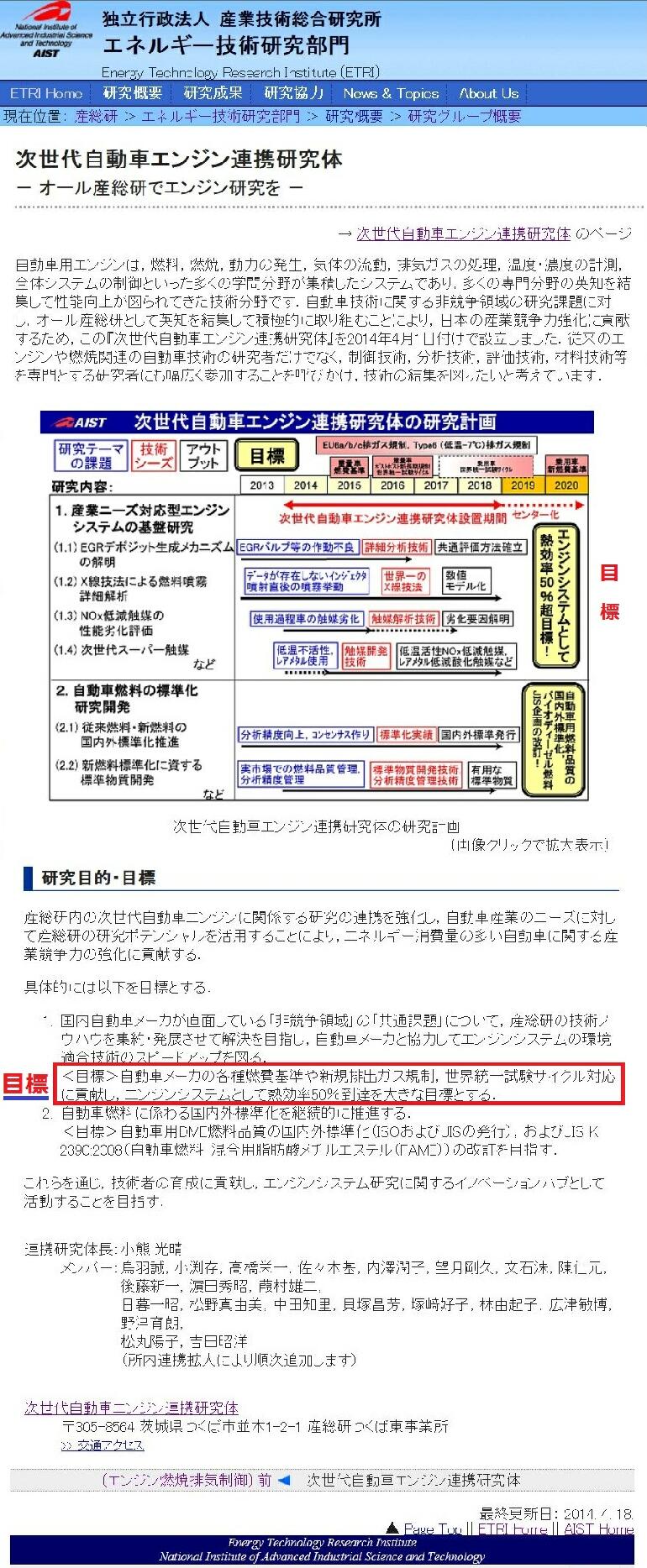 理由は、仮に、将来の何れかの時期に、熱効率50%のエンジンシステムの目標が実現できていないとの批判を受けた 際、(独)産総研が当初から設定していた非公開の目標達成の時期が100〜200年後であったとの言い逃れをするため の準備かも知れない。その場合には、(独)産総研の「次世代自動車エンジン連携研究体」の小熊光晴氏、鳥羽誠氏、 小渕存氏、後藤新一氏を含む学者・専門家は、「自動車メーカの各種燃費基準や新規排出ガス規制、世界統一試験 サイクル対応に貢献」や、「熱効率50%のエンジンの実現」の目標を達成することについては、その意図・意向が最初 から全く無かったと考えられる。これが事実か否かの真相は、当事者のみが知っていることだ。