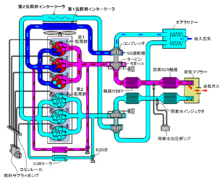 る。その構造は、6気筒エンジンを第1気筒群と第2気筒群に分け、気筒群毎に独立した吸気通路、排気通路、EGR ガス通路の各通路を設け、それら通路毎にEGR弁、EGRクーラ、EGR通路、過給装置、給気インタークーラ、排気絞 り弁、DPF装置、酸化触媒装置、NOx吸蔵還元装置、尿素SCR装置等の吸排気関連制御装置を配置し、それぞれ の気筒群毎の吸入空気、EGRガスおよび排気ガスの流れが互いに混合しない流れ通路の回路としたことが特徴であ る。