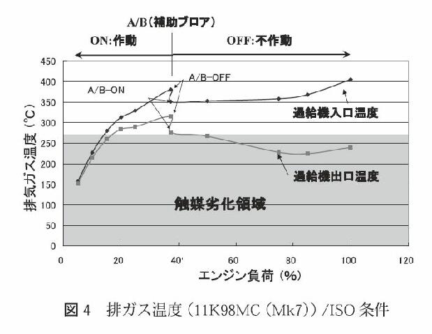 ルエンジンでは、以下の図3−2に示したように、エンジンの出力の低下に伴って「タービン入口の排気ガスの 温度と圧力の低下」および「ターボ過給機の効率低下」等により、給気量(=掃気量・吸入空気量)の不足が生 じる。この不具合の軽減を図るため、エンジンの出力が40%以下となる領域では、吸入空気量の増加を図る ために補助ブロワを作動させる対策が施されている。